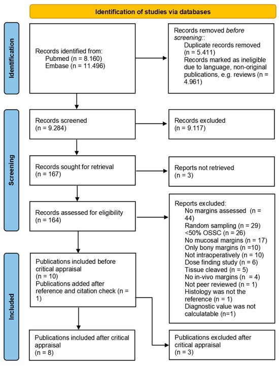 - Carnicelli, G.; Disconzi, L.; Cerasuolo, M.; Casiraghi, E.; Costa, G.; De Virgilio, A.; Esposito, A.A.; Ferreli, F.; Fici, F.; Casto, A.L.; et al. Image-Guided Intraoperative Assessment of Surgical Margins in Oral Cavity Squamous Cell Cancer: A Diagnostic Test Accuracy Review. Diagnostics 2023, 13, 1846. [Google Scholar] [CrossRef]