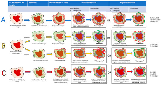 - Method A: Interventional studies (with or without a WL-safety margin control group). Surgical margins were enlarged when the index-positive area exceeded the WL-safety margin. SCC and/or dysplasia determined the TN or FN in the index-negative areas surrounding the index-positive areas. Index-positive areas were not analyzed; hence, only the NPV could be calculated. Three studies used this methodology [36,38,39].