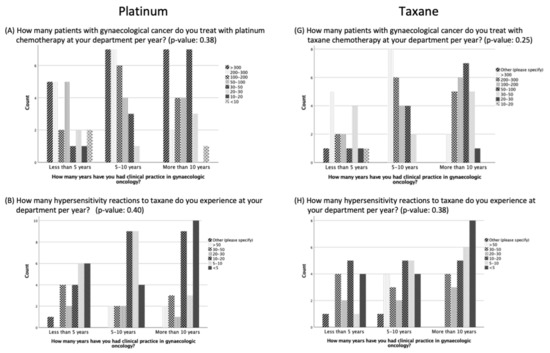 Clinicians treating gynecological cancers regularly experience HSRs to platinum- and taxane-based chemotherapy (8–16% and 10–13%, respectively) [11,12,17,19,21,23,24], which is also due to the fact that more lines of treatment are being used in gynecological cancer than 1–2 decades ago [25]. Additionally, real HSR rates are likely to be underestimated, as oncologists often report only severe reactions [10,26]. Our study showed a high frequency of HSRs, with more than 73% of the participants treating more than five patients with HSRs to platinum- and taxane-based chemotherapy, which emphasizes the need to find a strategy to maintain the optimal treatment regimen in this large group of patients.