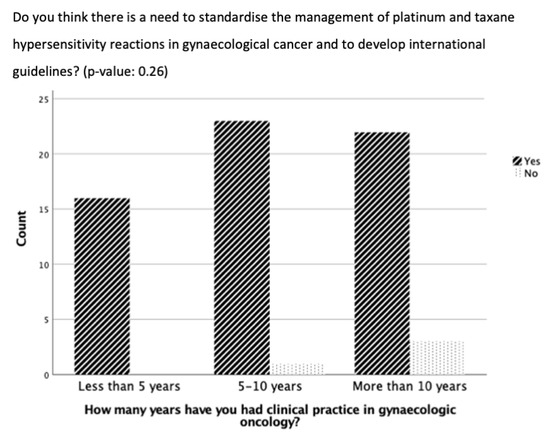 No significant difference was evident in the results of the questions comparing participants with less than five years, five to ten years, or more than ten years of clinical practice experience (Figure 1). However, participants with more than ten years of experience were more likely to report experiencing <5 or 5–10 HSRs to taxane per year than the participants with five to ten years of experience or less than 5 years of experience (p = 0.38, 8 vs. 6 vs. 4 and 5 vs. 4 vs. 1, respectively) (Figure 1). In addition, there was a trend that the longer the experience in clinical practice, the more often the participants did not think there was a need for standardization and guidelines for managing HSRs to taxane and platinum (p = 0.26) (Figure 2).