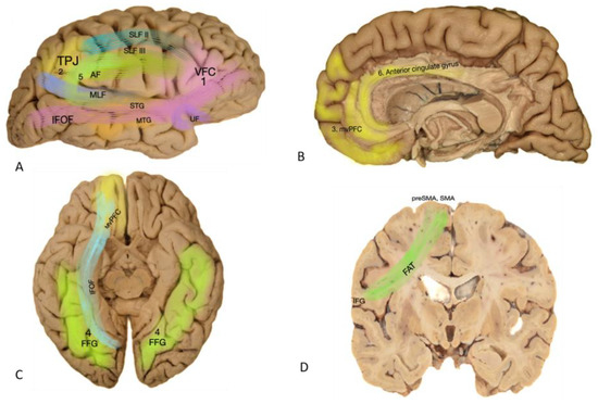 Social cognition encompasses theory of mind, nonverbal language—primarily facial emotion recognition—and empathy. Despite the lack of consensus on the anatomical demarcations of social cognition function, several studies have indicated that these functions are distributed across various regions of the “facial network,” including the anterior cingulate gyrus, the medial ventral PFC, the gyrus rectus, the medial aspect of the superior frontal gyrus, both occipito-temporal cortices, and the posterior part of the right superior temporal sulcus (STS) (Figure 2). Consequently, any lesion infiltrating these areas may lead to disorders in one or several functions of social cognition. Transcranial magnetic stimulation of the posterior part of the right STS has been shown to improve the recognition of emotions in healthy volunteers [49]. The cingulum, which links the rostral medial prefrontal cortex/anterior cingulate and the medial posterior parietal cortex (including the posterior cingulate cortex and ventral precuneus), is involved in the default mode network and may participate in some aspects of conscious information processing. The disruption of this subcortical connectivity on the posterior cingulate cortex can lead to a breakdown in consciousness in awake patients, resulting in transient behavioral unresponsiveness and a loss of connectedness to the external environment [50]. Another study supported the role of the right hemisphere in emotional and behavioral disorders in patients with frontotemporal lobar degeneration (FTD), positing a dominant role of the right hemisphere for emotional functions [51,52,53,54,55]. There are also reports about the role of the amygdala and insula in facial emotion recognition. The scattered nature of social cognition functions suggests using corresponding testing methods in cases where any of these centers are affected by lesions.