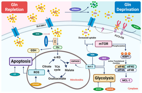 Current strategies targeting glutamine metabolism in cancer cells focus on its depletion, glutaminase inhibition, and inhibition of glutamine uptake by blocking its membrane transporters. As a result, combined treatment strategies have emerged to combat drug resistance and enhance anti-tumor efficacy. AML cells are generally reliant on glutamine and mitochondrial OXPHOS for survival [15]. Notably, inhibitors of GLS1, such as BPTES, compound 938, and compound CB-839, are available, with CB-839 undergoing human clinical trials for hematological malignancies. Inhibiting glutamine metabolism via CB-839 significantly disrupts the production of glutathione in various AML types, leading to an accumulation of mitochondrial reactive oxygen species (mitoROS) and apoptotic cell death [15]. The inhibition of GLS1 induces apoptosis through caspase activation, predominantly involving the intrinsic mitochondrial apoptotic pathway [15]. In primary AML leukemic stem cells, high-level expression of BCL-2 supports OXPHOS, rendering the cells to be highly sensitive to BCL-2-specific inhibitors [23]. Combining CB-839 with one of these BCL-2 inhibitors, Venetoclax, demonstrates promising clinical potential for treating AML by inhibiting glutaminolysis, triggering mitochondrial depolarization, and inducing intrinsic caspase-dependent apoptosis, thus exhibiting potent anti-leukemic activity [15].