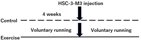 Study design. Mice were divided into an exercise group and a control group, and, four weeks after the start of the study, HSC-3-M3 oral cancer cells were transplanted. The mice were observed for another four weeks.