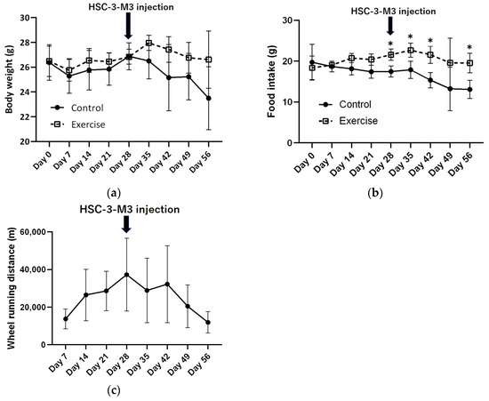 There was no significant difference in body weight between the exercise group and the control group prior to injection (Figure 2a). Food intake was significantly greater in the exercise group throughout the entire period (Figure 2b). The wheel running distance increased before tumor injection but decreased gradually after injection (Figure 2c).