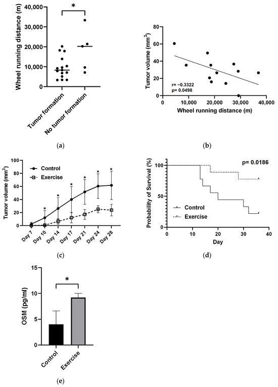 Effect of exercise on tumorigenesis and tumor volume, survival, and blood myokine levels. (a) Comparison of average daily wheel running distances before tumor injection in mice with and without tumor formation. * p < 0.05. (b) Correlation between tumor volume and average daily wheel running distances before tumor injection. (c) Changes in tumor volume after tumor transplantation in exercised and control mice. * p < 0.05. (d) Survival comparison between the exercised and control groups of mice. p values were calculated by the log-rank test. (e) Exercise-induced changes in blood oncostatin M (OSM) levels measured by ELISA. p values were calculated by t tests. * p < 0.05.