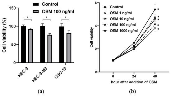 Effect of OSM addition on oral cancer cell lines. (a) Cell viability of OSM group against control group (100%) 48 h after addition of OSM using Cell Counting Kit-8. * p < 0.05. (b) Absorbance ratio of HSC-3-M3 treated with various concentrations of OSM using Cell Counting Kit-8 to that of OSM 24 and 48 h after addition of OSM. * p < 0.05.