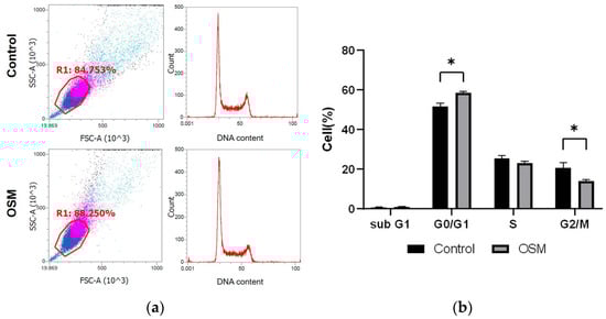 Effect of OSM addition on the cell cycle in HSC-3-M3 cells. Cell cycle was analyzed with Invitrogen™ Attune™ NxT cytometer by adding FxCycle TM PI/RNase Solution to each of the control and OSM groups. (a) The left figure shows the cell population analyzed by flow cytometry. Pink dots indicate a high cell population detected, while blue dots indicate a low cell population detected. The right figure shows the DNA content and cell count of the circled cell population. The y-axis indicates the number of cells and the x-axis indicates DNA content. (b) Comparison of the percentage of cells in each region analyzed by flow cytometer. * p < 0.05.
