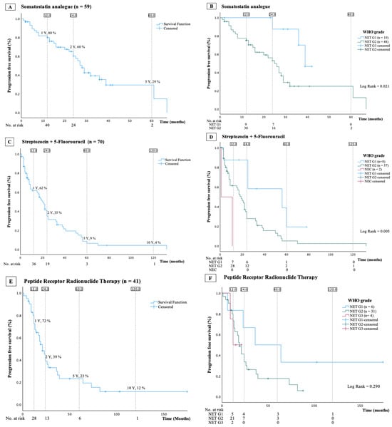 Kaplan–Meier curves presenting overall progression-free survival and progression-free survival stratified by WHO grade in patients treated with somatostatin analogue (A,B), with streptozocin/5-fluorouracil (C,D), or with peptide receptor radionuclide (E,F).
