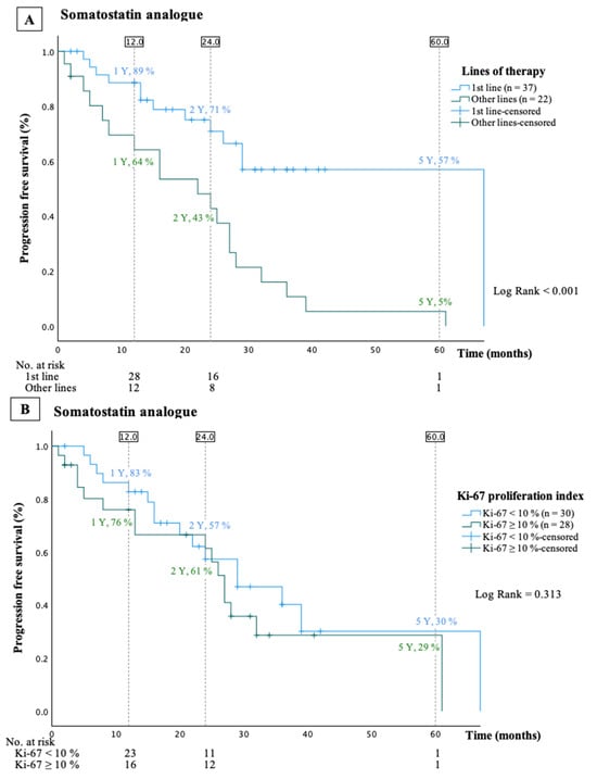 Kaplan–Meier curves presenting progression-free survival stratified by treatment line (A) or by Ki-67 index (B) in patients treated with somatostatin analogue.