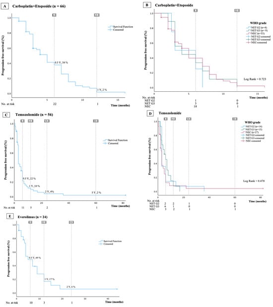 Kaplan–Meier curves presenting overall progression-free survival and progression-free survival stratified by WHO grade in patients treated with carboplatin and etoposide (A,B), with temozolomide (C,D), or with everolimus (E).
