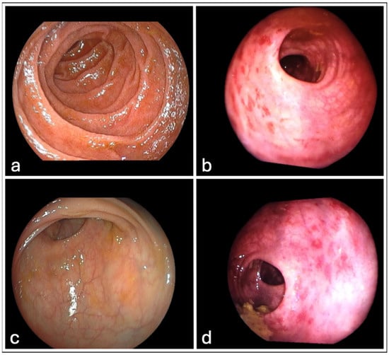 Typical images from two patients undergone rectoscopy. (a,c) display normal rectal mucosal before starting radiotherapy. (b,d) show the same patients 12 months after receiving radiotherapy, displaying rectal mucosal injury VRS1.