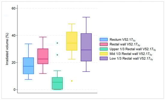 Boxplot graph that shows the median percentage along with 25th, 75th percentiles, of irradiated volume between rectum, rectal wall and its subsegments for the specific dose endpoint of V52.17Gy. The dots represent the outliers.