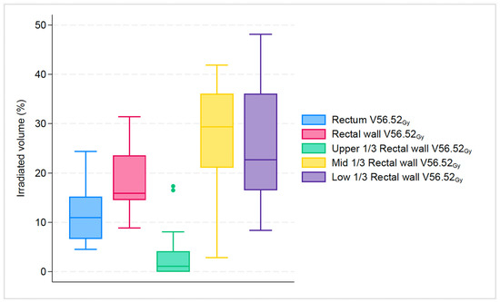Boxplot graph that shows the median percentage along with 25th, 75th percentiles, of irradiated volume between rectum, rectal wall and its subsegments for the specific dose endpoint of V56.52Gy. The dots represent the outliers.