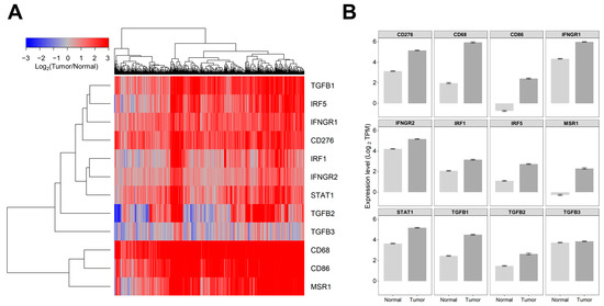 Comparing the levels of mRNA expression in normal brain tissue and tumor samples obtained from patients with LGG. We utilized log2 transformed transcripts per million (TPM) summarized RNAseq data files (https://toil-xena-hub.s3.us-east-1.amazonaws.com/download/TcgaTargetGtex_rsem_gene_tpm.gz, accessed on 25 July 2023) downloaded from the UCSC Xena web platform (https://xenabrowser.net/datapages/, accessed on 25 July 2023) to compare gene expression levels for 509 LGG patients versus 1141 brain samples from all regions of the brain. This resource reports results from the UCSC Toil RNAseq recompute compendium, which is a standardized realigned and recalculated gene and transcript expression data set for all TCGA, TARGET, and GTEx samples that enables users to contrast gene and transcript expression between TCGA “tumor” samples and corresponding GTEx “normal” samples. (A) Depicted is a cluster figure of the mRNA expression levels for TGFB1/2/3, interferon-gamma-activated receptors and the corresponding downstream signaling molecules (IFNGR1, IFNGR2, STAT1, IRF1, and IRF5), and markers for tumor-associated macrophages (TAMs) from LGG patients mean centered to the corresponding mRNA expression levels in normal brain tissue. The cluster figure shows the log2-transformed fold-change values (blue represents underexpression, and the red color represents overexpression in samples from LGG patients). TGFB1, IRF5, IFNGR1, and CD276 formed a co-regulated cluster, and the three TAM markers, CD68, CD86, and MSR1, formed another highly coregulated cluster. (B) Examination of the average expression levels of these genes (±SEM) revealed that all genes except TGFB3 (p = 0.1) were upregulated in tumor tissue (p < 0.0001).