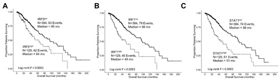 Interferon-gamma receptor-activated downstream signaling molecules also exhibited negative prognostic outcomes at increased levels of mRNA expression. Patients with high levels of IRF5 (IRF5high; median = 64 months; 95% CI = 40.8–NA months, N = 129, 42 events) had significantly shorter overall survival (OS) times compared to those with low levels of IRF5 (IRF5low; median = 95 months; 95% CI = 75–134 months; N = 384, 83 events, log-rank Chi-square = 10.55, p = 0.001) (Figure 3A). Similarly, patients with high levels of IRF1 (IRF1high; median = 49 months; 95% CI = 30.2–NA months; N = 129, 46 events) exhibited significantly shorter OS times compared to those with low levels of IRF1 (IRF1low; median = 98 months; 95% CI = 78.2–134 months, N = 384, 79 events, log-rank Chi-square = 30.11, p < 0.0001) (Figure 3B). Additionally, patients with high levels of STAT1 (STAT1high; median = 51 months, 95% CI = 34–75 months, N = 129, 51 events) exhibited significantly worse OS times compared to those with low levels of STAT1 (STAT1low; median = 98 months, 95% CI = 87.5–145.1 months, N = 384, 74 events, log-rank Chi-square = 27.62, p < 0.0001) (Figure 3C).