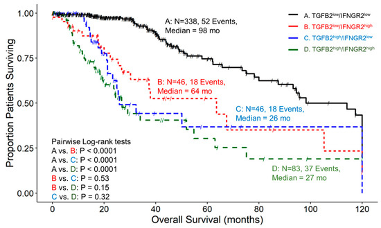 We determined the prognostic influence of TGFB2 mRNA levels in the context of high and low levels of IFNGR2 mRNA levels and the corresponding mRNA coding for signaling proteins IRF1/5 and STAT1 by stratifying patients into four groups with combinations of high and low expression of both genes. At low levels of IFNGR2, TGFB2high patients exhibited worse OS compared to TGFB2low patients (median = 26 and 98 months, respectively; p < 0.0001). At high levels of IFNGR2, the TGFB2high group of patients exhibited shorter survival times, but this reduction was not statistically significant (median = 27 versus 64 months; p = 0.15). At low levels of TGFB2 mRNA levels, IFNGR2high group of patients exhibited worse survival outcomes compared to IFNGR2low patients (median = 64 vs. 98 months respectively; p < 0.0001)) (Figure 4).