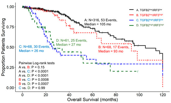 Examining patients with high and low combinations of TGFB2 and IRF5 expression showed that the median survival time for 316 patients in expression group TGFB2low/IRF5low was 105 months, with 53 recorded events and a 95% confidence interval of 80–120 months (Figure 5). For the group of TGFB2low/IRF5high patients, the median survival time for 68 patients was 93 months, with 17 recorded events and a 95% confidence interval of 63.5 to NA months. In the group of TGFB2high/IRF5low patients, the median survival time for 68 patients was 26 months, with 30 recorded events and a 95% confidence interval of 21 to NA months. Lastly, for the expression group TGFB2high/IRF5high, the median survival time for 61 patients was 27 months, with 25 recorded events and a 95% confidence interval of 23.9 to NA months. At lower expression levels of IRF5 mRNA expression, there was a significant difference between the TGFB2low/IRF5low and TGFB2high/IRF5low groups of patients (105 compared to 26 months, respectively; p < 0.0001)). At higher levels of IRF5 mRNA expression, there was a significant difference between low and high levels of TGFB2 expression (TGFB2low/IRF5high versus TGFB2high/IRF5high (93 compared to 27 months, respectively; p = 0.0007)) (Figure 5).