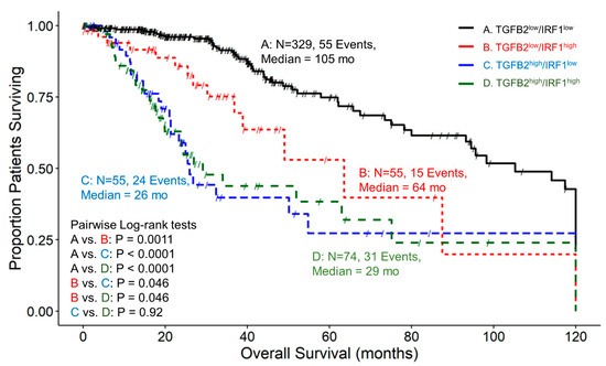 We examined the impact on OS for patients expressing high and low combinations of TGFB2 and IRF1. A total of 329 patients in the TGFB2low/IRF1low group (Figure 6) exhibited a median survival time of 105 months (95% CI = 93.2–120, 55 events). The TGFB2low/IRF1high group was composed of 55 patients, with 15 death events and a median survival time of 64 months (with a 95% CI of 39–NA). The TGFB2high/IRF1low group experienced 24 death events among 55 patients, resulting in a median survival time of 26 months (with a 95% CI of 21.3–NA). Lastly, out of 74 patients in the TGFB2high/IRF1high group, 31 experienced death events and exhibited a median survival time of 29 months (with a 95% CI of 23.7–NA). We revealed that at IRF1low mRNA levels, TGFB2low patients experienced longer OS than TGFB2high patients (105 versus 26 months, respectively; p < 0.0001). Also, comparing IRF1high groups of patients, it was shown that patients with high levels of TGFB2 experienced shorter OS times compared to TGFB2low (29 versus 64 months, respectively; p = 0.046) than patients expressing low levels of TGFB2 mRNA. At TGFB2low mRNA levels, IRF1high patients exhibited significantly shorter OS times than IRF1low patients (64 vs. 105 months, respectively; p = 0.0011) (Figure 6).