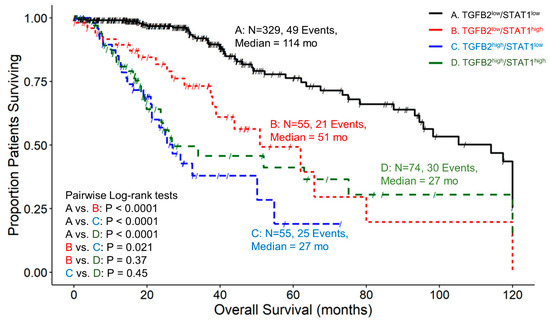 LGG patients with high levels of TGFB2 and STAT1 mRNA expression exhibited significantly shorter OS times than patients with low levels of TGFB2 and STAT1 expression. We analyzed clinical metadata and RNA sequencing data from 513 patients who were diagnosed with LGG (https://www.cbioportal.org/study/summary?id=lgg_tcga_pan_can_atlas_2018, accessed 20 April 2023). Our goal was to determine the correlation between high levels of expression for both TGFB2 and STAT1 (upper 25th percentile for the TGFB2 and STAT1; TGFB2high/STAT1high) and overall survival times compared to the patients with low expression of both genes (TGFB2low/STAT1low; below 75th percentile for both genes) or high and low combinations of both genes (TGFB2low/STAT1high, TGFB2high/STAT1low). The curves represent TGFB2low/STAT1low (A. black line), the TGFB2low/STAT1high group of patients (B. redline), the TGFB2high/STAT1low subset (C. blue line), and lastly, the TGFB2high/STAT1high patients (D. green line).