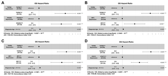 Using the multivariate Cox proportional hazards model, we demonstrated that the effect of TGFB2 and IFNGR2 on OS was statistically independent, controlling for the effect of age at diagnosis and the interaction term. The TGFB2high group of patients (HR (HR (95% CI range) = 4.07 (2.35–7.06); p < 0.001)) and IFNGR2high patients (HR (95% CI range) = 3.29 (1.91–5.65); p < 0.001) exhibited significant increases in HR compared to low TGFB2 or IFNGR2 groups, respectively (Figure 8A). Similarly, significant independent effects of the TGFB2high group of LGG patients who displayed a significant increase in HR (HR (95% CI range) = 4.48 (2.82–7.12); p < 0.001)) were independent of the effect observed for the IRF5high group of patients showing an increase in HR (HR (95% CI range) = 1.94 (1.12–3.37); p = 0.018). The hazard ratio was more than double that of the independent effect of TGFB2 compared to IRF5, controlling for age at diagnosis and the interaction term (Figure 8B). Both TGFB2 (HR (95% CI range) = 4.38 (2.67–7.17); p < 0.001) and IRF1 (HR (95% CI range) = 3.42 (1.9–6.15); p < 0.001) demonstrated independent increases in OS (Figure 8C). In the multivariate Cox proportional hazards model that included TGFB2 and STAT1, patients in the TGFB2high expression group exhibited a significant increase in HR (HR (95% CI range) = 6 (3.62–10.11); p < 0.001). Similarly, patients in the STAT1high group also displayed a significant increase in HR (HR (95% CI range) = 2.93 (1.75–4.91); p < 0.001) (Figure 8D).
