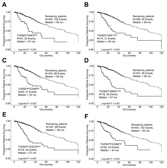 Further examination of subsets of patients that expressed high levels of both TGFB2 and IRF5 or IRF1 with respect to molecular subtypes and OS outcomes are depicted in Figure 9. Out of the 61 LGG patients in the TGFB2high/IRF5high subset of patients, 36 (59%) were classified as IDHwt genotype, and the survival outcome of these 61 patients was significantly worse than the remaining patients (TGFB2high/IRF5high median = 27 months (95% CI = 23.9–NA) vs. the remaining group median OS = 95 months (95% CI = 75–120 months; log-rank Chi-square = 28.97, p < 0.001)) (Figure 9A). Out of the 74 patients in the TGFB2high/IRF1high subset of patients, 48 (65%) were classified as IDHwt and the OS times exhibited a significant difference compared to the remaining patients (TGFB2high/IRF1high median = 29 months (95% CI: 23.7–NA) vs. remaining patients median = 95 months (95% CI: 75–120; log-rank Chi-square = 34.3, p < 0.001)) (Figure 9B). Next, we examined the negative prognostic cell markers for TAMs expressed at high levels of TGFB2, and CD68, MSR1, CD276, and CD86 cell markers exhibited worse OS outcomes (Figure 9C–F). The TGFB2high/CD68high group of 60 patients exhibited a median OS time of 34 months (95% CI = 23.7–NA months), which was significantly shorter than the OS for the remaining group of 453 patients with a median OS time of 95 months (95% CI = 75–120 months; log-rank Chi-square value = 24, p < 0.0001) (Figure 9C). The 76 patients with TGFB2high and MSR1high mRNA expression exhibited a median OS time of 27 months (95% CI = 23.7–63 months), which was significantly shorter than the median OS time for the remaining 437 patients of 96 months (95% CI of 78.2–120 months; log-rank Chi-square = 46.52, p < 0.0001) (Figure 9D). There was a significant difference in the survival rates among the groups comparing the TGFB2high/CD276high arm of the OS curve (median OS time for 76 patients was 27 months (95% CI = 23.7–63)) with the remaining 437 patients (median OS time of 96 months; 95% CI = 78.2–120) and 89 recorded events; log-rank Chi-square = 38.6, p < 0.0001) (Figure 9E). The survival outcomes between TGFB2high/CD86high and the remaining patients were found to be statistically significantly different (log-rank Chi-square = 20.2, p < 0.0001). Among 60 patients in the TGFB2high/CD86high group, the median OS time was 34 months (95% CI = 26–NA, and 23 events). For the remaining group, which consisted of 453 patients, the median OS time was 95 months (95% CI = 73.5–120) (Figure 9F).