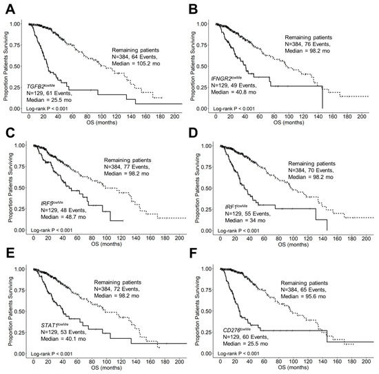 Figure 10A shows that the median OS time for 129 patients with low levels of methylation for the TGFB2 gene was 25.5 months (95% CI: 21.3–37.9, events = 61) and significantly shorter than for the 384 remaining patients (median OS = 105.2 months (95% CI: 80–139), events = 64; log-rank Chi-square = 96.5, p < 0.001). Patients with low levels of TGFB2 methylation were significantly over-represented in the patients with IDHwt genotype (92/92 = 100%) compared to 37 TGFB2lowMe patients with IDH mutations (37/421 = 8.8%; Fisher’s exact test, 2-tailed, p < 0.0001). The median OS time for LGG patients with low levels of methylation for the IFNGR2 gene was 40.8 months (95% CI: 33.2–75.2, events = 49) and was significantly shorter than the median OS time for the remaining patients (median OS = 98.2 months (95% CI: 80–134.2), events = 76; log-rank Chi-square = 39.2, p < 0.001). Patients with low levels of IFNGR2 methylation were significantly over-represented in the patients with IDHwt genotype (64/92 = 69.6%) compared to 65 IFNGR2lowMe patients with IDH mutations (65/421 = 15.4%; p < 0.0001) (Figure 10B). The median OS time for 129 patients with low levels of methylation for the IRF5 gene was 48.7 months (95% CI: 37.9–94.5, events = 48) and was significantly shorter than the median OS time for the remaining patients (median OS = 98.2 months (95% CI: 80–139), events = 77; log-rank Chi-square = 23.03, p < 0.001). Patients with low levels of IRF5 methylation were significantly over-represented in the patients with IDHwt genotype (52/92 = 56.5%) compared to 77 IRF5lowMe patients with IDH mutations (77/421 = 18.3%; p < 0.0001) (Figure 10C). The median OS time for 129 patients with low levels of methylation for the IRF1 gene was 34 months (95% CI: 26.8–48.7, events = 55) and was significantly shorter than the median OS time for the remaining patients (median OS = 98.2 months (95% CI: 80–139), events = 70; log-rank Chi-square = 58.5, p < 0.001). Patients with low levels of IRF1 methylation were significantly over-represented in the patients with IDHwt genotype (68/92 = 73.9%) compared to 61 IRF1lowMe patients with IDH mutations (61/421 = 14.5%; p < 0.0001) (Figure 10D). The median overall survival time for 129 patients with low levels of methylation for the STAT1 gene was 40.1 months (95% CI: 31.4–75.2), events = 53) and was significantly shorter than the median OS for the remaining patients (median OS = 98.2 months (95% CI: 80–139), events = 72; log-rank Chi-square = 32.8, p < 0.001). Patients with low levels of STAT1 methylation were significantly over-represented in the patients with IDHwt genotype (55/92 = 59.8%) compared to 74 STAT1lowMe patients with IDH mutations (74/421 = 17.6%; p < 0.0001) (Figure 10E). The median OS time for 129 patients with low levels of methylation for the CD276 gene was 25.5 months (95% CI: 21.3–37.9, events = 60) and was significantly shorter than the median OS time for the remaining patients (median OS = 95.6 months (95% CI: 80–133.7), events = 65; log-rank Chi-square = 83.7, p < 0.001). Patients with low levels of CD276 methylation were significantly over-represented in the patients with IDH-wildtype genotype (89/92 = 96.7%) compared to 40 CD276lowMe patients with IDH mutations (40/421 = 9.5%; p < 0.0001) (Figure 10F).