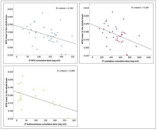 Correlation analyses between neuroimaging outcomes and chemotherapy agents’ cumulative doses are presented in Table 4. No association between WM volume and cumulative doses was found. The effective corticosteroid cumulative dose was associated with smaller intracranial volume in survivors (r = −0.298, p = 0.041, FDR adj.-p = 0.068), yet the multiplicity correction rendered those findings statistically inconclusive. No association was found between intravenously administered MTX dosage and the neuroimaging outcomes, suggesting less neurotoxicity from intravenous administration compared to IT administration. In agreement with the above, cumulative doses of intrathecally administered chemotherapy, including MTX, demonstrated substantial negative correlations with the MTR means. Higher IT-MTX dose was associated with a smaller mean MTR in the whole brain (r = −0.403, p = 0.008, FDR adj.-p = 0.015), the right hemisphere (r = −0.434, p = 0.005, FDR adj.-p = 0.013), the left hemisphere (r = −0.347, p = 0.021, FDR adj.-p = 0.035), the whole CC (r = −0.283, p = 0.050, FDR adj.-p = 0.083), and its anterior section (r = −0.351, p = 0.019, FDR adj.-p = 0.048). The correlations between IT-MTX dosages and MTR means maintained their statistical significance after the FDR correction except for the whole CC. Similar results have been found for IT-cytarabine. The IT-cytarabine cumulative dose was negatively correlated with the mean MTR in the whole brain (r = −0.405, p = 0.008, FDR adj.-p = 0.015), the right hemisphere (r = −0.437, p = 0.004, FDR adj.-p = 0.013), the left hemisphere (r = −0.349, p = 0.020, FDR adj.-p = 0.035), the whole CC (r = −0.284, p = 0.049, FDR adj.-p = 0.083), and its anterior section (r = −0.359, p = 0.017, FDR adj.-p = 0.048). These associations survived correction for multiple comparisons except for the whole CC. As IT-MTX and IT-cytarabine dosages were strongly related to each other in our sample (r = 0.954, p < 001), it is unclear whether neurotoxic effects arise more from one IT agent or the other or from both. The literature extensively documents MTX’s long-term neurotoxicity, ranking it among the most neurotoxic chemotherapy agents, while recent findings raise concerns about a potentially harmful interaction between IT-MTX and IT-cytarabine [58,59,60,61,62]. Furthermore, the IT-hydrocortisone cumulative dose was negatively correlated with the mean MTR in the whole brain (r = −0.533, p = 0.009, FDR adj.-p = 0.015), the right hemisphere (r = −0.532, p = 0.009, FDR adj.-p = 0.015), the left hemisphere (r = −0.512, p = 0.013, FDR adj.-p = 0.035), the whole CC (r = −0.398, p = 0.046, FDR adj.-p = 0.083), and its anterior section (r = −0.405, p = 0.043, FDR adj.-p = 0.072), mid-anterior section (r = −0.465, p = 0.022, FDR adj.-p = 0.110), and mid-posterior section (r = −0.393, p = 0.048, FDR adj.-p = 0.240). After FDR correction, the dosage associations with the mean MTR in the whole brain, the right hemisphere, and the left hemisphere maintained their statistical significance. Note that the IT-hydrocortisone dosages were not correlated with the IT-MTX (p = 0.286) and IT-cytarabine dosages (p = 0.320). Figure 1 displays the scatter diagrams of the relationship between IT agents’ dosage and the MTR mean in the whole brain.