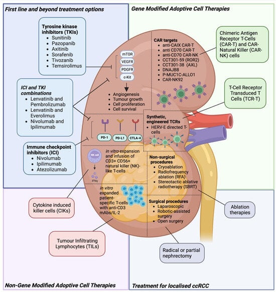 Overview of Treatment Modalities for clear cell RCC (ccRCC). The figure provides a comprehensive overview of the diverse treatment modalities employed for ccRCC. Surgical interventions and radical or partial nephrectomy employ various approaches for direct kidney or tumour removal. Tyrosine kinase inhibitors (TKIs) such as Sunitinib, Pazopanib and Axitinib disrupt critical signalling pathways associated with angiogenesis and cell proliferation. Immunotherapeutic agents, immune checkpoint inhibitors (ICIs) such as Nivolumab and Ipilimumab, enhance the immune response against cancer cells. Additionally, cytokine-induced killer cells (CIKs) and tumour-infiltrating lymphocytes (TILs) involve the selection and in vitro expansion of tumour-reactive cells, infused back into the patient for enhanced cytotoxicity. The emerging field of gene-modified adoptive cell therapies for ccRCC, specifically focusing on Chimeric Antigen Receptor T-Cells (CAR-T) and CAR-NK cells, is highlighted. This includes promising CAR-T therapies targeting CAIX, CD70, AXL, ROR2, and DNAJB8, with ongoing phase I/II clinical trials representing advancements in this area. Additionally, engineered T-cell receptors (TCRs), exemplified by HERV-E-directed TCR-T therapy, are designed to recognize intracellular tumour-associated antigens, presenting a promising avenue for personalized treatment in ccRCC.