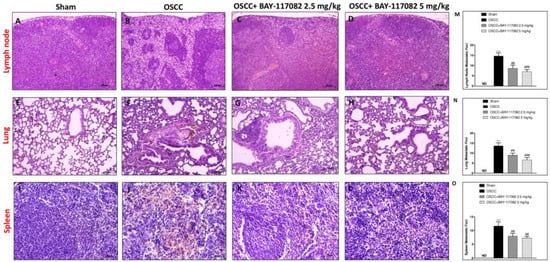 BAY-117082 treatment modulated the metastasis process in the lymph node, lung, and spleen. Histological analysis revealed that the treatment with BAY-117082 at doses of 2.5 and 5 mg/kg was able to reduce the degree of metastasis in the lymph node (C,D,M), lung (G,H,N), and spleen (K,L,O) in the C group compared with the OSCC group (B,F,J). (A,E,I) Control groups in the lymph node, lung, and spleen. Data are representative of at least three independent experiments. ND, not designed. *** p < 0.001 vs. sham; ### p < 0.001 and vs. ## p < 0.01 OSCC.