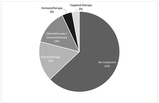 Ultimately, 27 (37%) patients underwent systemic treatment with a median time of 37.5 days from diagnosis to initiation of treatment. Of these 27, 22 received chemotherapy with or without immunotherapy (Figure 1). Three patients received immunotherapy alone, and two patients received epidermal growth factor receptor (EGFR) tyrosine kinase inhibitors (TKI’s) based on molecular studies.