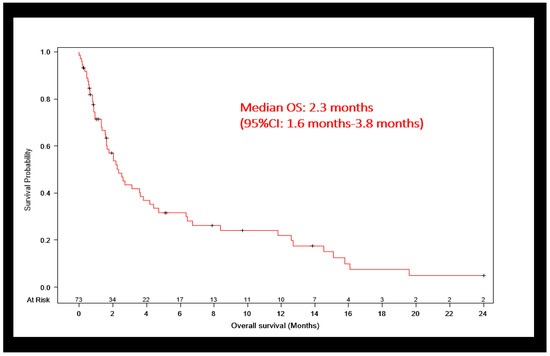 The median overall survival (OS) of our entire patient population was extremely poor, at 2.3 months (Figure 2). The estimated 6-month and 12-month OS rates were 32% and 22%, respectively. Survival did not significantly differ between patients who were discharged to home versus a facility (2.7 vs. 2 months). Fifty-six (76.7%) patients ultimately died. However, only 23 (31.5%) were enrolled in a hospice at any time (Table 1).