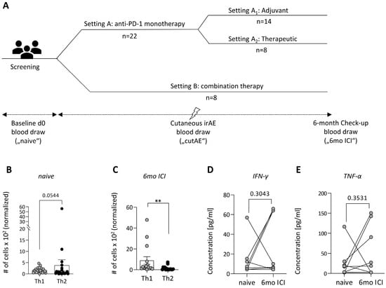 Study design and Th1/Th2 immune profile of patients. (A) Clinical study design. (B) Th1 and Th2 cells in melanoma patients’ PBMCs prior to ICI (naive) and (C) after 6 months of treatment (6mo ICI) were analyzed by flow cytometry (n = 22, mean with SEM, students t-test with Mann–Whitney correction, ** p < 0.01). (D) Plasma levels of Th1-associated cytokines IFN-γ and (E) TNF-α over the course of ICI (n = 15, Student’s paired t-test).