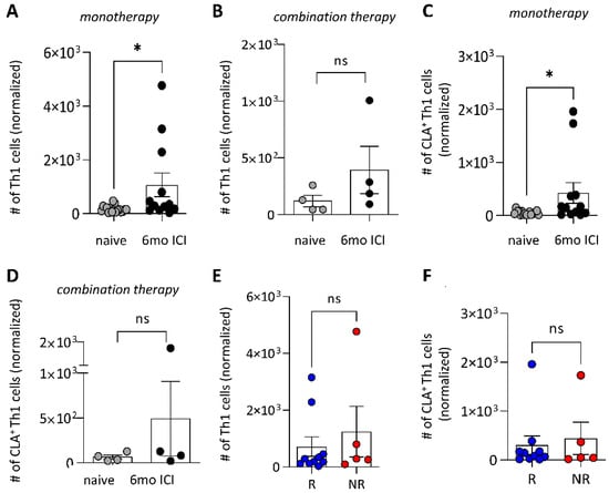 Shift towards Th1 cells in PBMCs during ICI. T-cell subsets in patients’ blood were analyzed by flow cytometry to define CD3+CD4+CXCR3+ Th1 cell numbers in patients receiving (A) anti-PD1 monotherapy (n = 19, mean with SEM, paired t-test with Welch’s correction, * p < 0.05, ns p > 0.05) or (B) anti-PD1/anti-CTLA4 combination therapy (n = 4, mean with SEM, paired t-test with Welch’s correction, ns p > 0.05). CD3+CD4+CXCR3+ CLA+ skin-homing Th1 cells were analyzed in patients receiving (C) anti-PD1 monotherapy (n = 19, mean with SEM, paired t-test with Welch’s correction, * p < 0.05) or (D) anti-PD1/anti-CTLA-4 combination therapy (n = 4, mean with SEM, paired t-test with Welch’s correction, ns p > 0.05). (E) Comparison of Th1 cells between responders (R, blue, n = 9) and non-responders (NR, red, n = 5) and (F) CD3+CD4+CXCR3+CLA+ skin-homing Th1 cells between responders (R, blue, n = 9) and non-responders (NR, red, n = 5) (mean with SEM, unpaired t-test with Welch’s correction, ns p > 0.05).