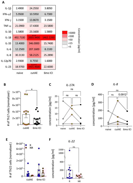 CutAEs show a Th17/Th22-related immune profile. (A) Cytokines in the plasma of patients were measured with an enzyme-linked immunosorbent assay before ICI (“naive”), during a cutAE (“cutAE”) and after 6 months of therapy (“6mo ICI”). Heatmap representation of median concentrations given in pg/mL. A color gradient is depicted from 0 to 5000 pg/mL (n = 30, 2way ANOVA, *** p < 0.005; **** p < 0.001. (B) Flow cytometry analysis of PBMCs for CD3+CD4+CCR4+CCR6+ Th17 cells (n = 10, mean with SEM, paired t-test, * p < 0.05). Plasma level analysis of (C) IL-17A and (D) IL-8 in patients (n = 7, paired t-test, ns p > 0.05). (E) Flow cytometry analysis of PBMCs for CD3+CD4+CCR10+ Th22 cells in responders (R, blue, n = 11) and non-responders (NR, red, n = 6) (mean with SEM, 2-way ANOVA). (F) Plasma levels of IL-22 during a cutAE between responders (R, blue, n = 11) and non-responders (NR, red, n = 6) (mean with SEM, unpaired t-test, ns p > 0.05).