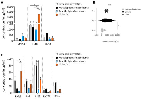 Cytokine profile of different cutAEs. (A) Plasma levels of inflammation-associated cytokines MCP−1 (CCL2), IL−18 and IL−33 in different subtypes of cutAEs (lichenoid dermatitis = grey, n = 2; maculopapular exanthema = dark grey, n = 3; acantholytic dermatosis = blue, n = 3; urticaria = orange, n = 3). Significantly higher plasma levels of IL-18 in urticaria (mean with SEM, 2-way ANOVA, ** p < 0.01). (B) Plasma levels of IL−18 in T-cell-driven cutAEs (light grey, n = 7) compared to mast-cell-driven urticaria (black, n = 3) and gastric colitis (stripped, n = 2) (mean with SEM, 2-way ANOVA, * p < 0.05). (C) Plasma levels of Th17-associated cytokines IL−1β, IL−6, IL−23, IL−17A and IFN−γ in different subtypes of cutAEs (lichenoid dermatitis = grey, n = 2; maculopapular exanthema = dark grey, n = 3; acantholytic dermatosis = blue, n = 3; urticaria = orange, n = 3) (mean with SEM, 2-way ANOVA, * p < 0.05).