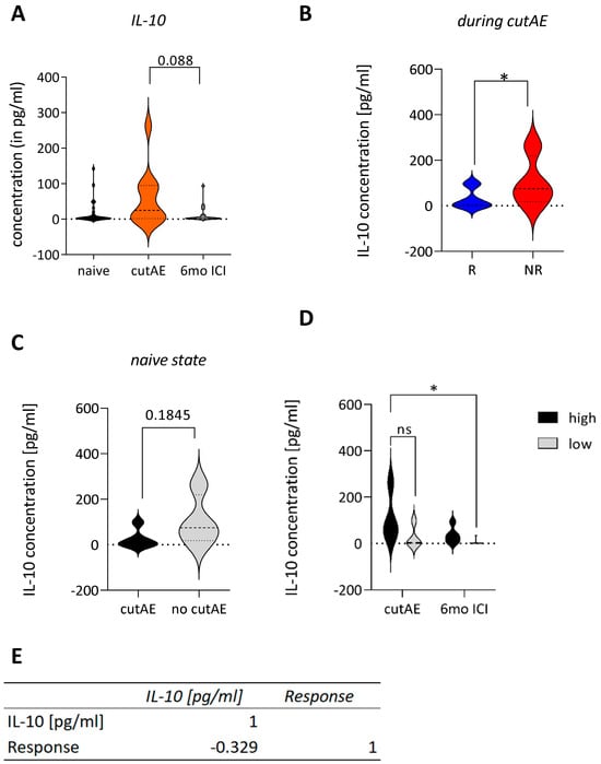 IL−10 as a prognostic marker. (A) High plasma IL−10 in patients during cutAEs (n = 24, mean with SEM, paired t-test with Wilcoxon correction). (B) Higher plasma IL−10 levels in non-responding patients during cutAEs (n = 11, mean with SEM, unpaired t-test * p < 0.05). (C) High naive plasma levels of IL−10 in patients who developed cutAEs as compared to patients not developing cutAEs during ICI. (D) Naive patients were grouped as IL−10high and IL−10low patients and the development of IL−10 in the plasma was analyzed during ICI. naïve IL−10high patients show a tendency to have higher IL−10 concentrations during cutAEs (n = 11, mean with SEM, 2-way ANOVA, * p < 0.05, ns p > 0.05). (E) Pearson correlation analysis of baseline IL−10 levels (in pg/mL) and response. Pearson’s r-values as indicated in the table (p < 0.09).