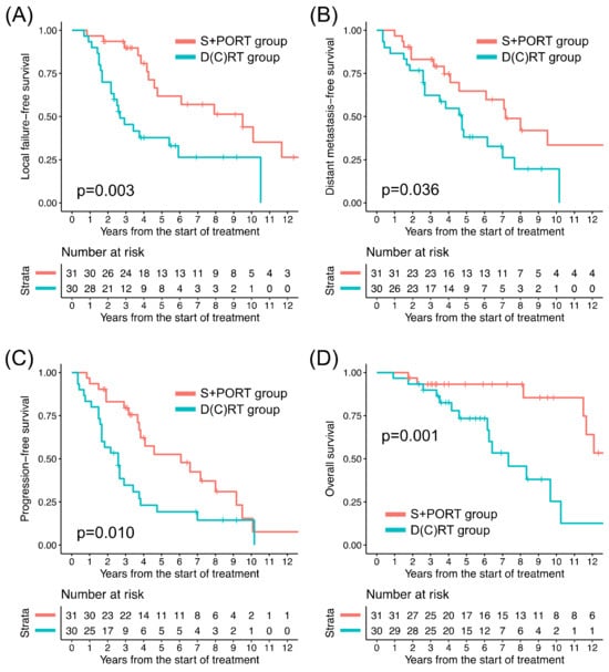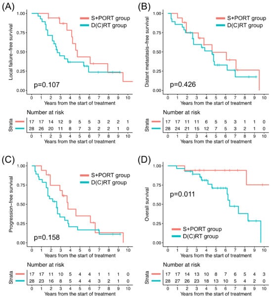 Kaplan–Meier curves of (A) local failure-free survival, (B) distant metastasis-free survival, (C) progression-free survival, and (D) overall survival of two treatment groups for all patients. D(C)RT: definitive radiation therapy ± concurrent chemotherapy, S+PORT: surgery followed by postoperative radiation therapy.