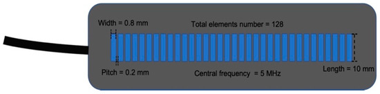 A prototype of a flexible array transducer (made by Hitachi and Japan Probe) was used and connected to the Vantage 128 system (Verasonics Inc., Kirkland, WA, USA). The parameter details of this transducer are shown in Figure 3. One element was used for transmitting and one hundred and twenty-eight elements were used for receiving. The overall workflow for these experimental ultrasound images is illustrated in Figure 4.