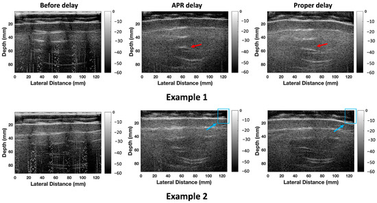 As noted above, experimental ultrasound image data present more complex and diverse responses, along with noise, especially due to high disorder responses originating from the bottom of the interface between the assistant structure and the phantom surface. To mitigate the risk of outliers in the estimated delay, a threshold value of 5 was set for the estimated received delays between two sets of raw data. The total estimated delays for each column are calculated by summing the referenced delays obtained from the first round of APR with the individual delays from the second round of APR. After applying the APR delays, the summation calculation across the element dimension and standard post-processing steps, including envelope detection and log compression, are performed to reconstruct the final B-mode ultrasound images.