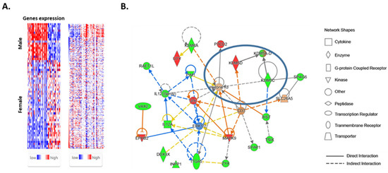 Sex-biased gene networks and interactions were analyzed using ingenuity pathway analysis (IPA) software (https://digitalinsights.qiagen.com/IPA (accessed on 1 January 2020). Those genes with known gene symbols (HUGO) were uploaded into the software and mapped using the Ingenuity Pathways Knowledge Base. Networks of these genes were algorithmically generated based on their connectivity. The network identified was then presented as a graph indicating the molecular relationships between genes/gene products. Genes were integrated into the computationally generated networks on the basis of the evidence stored in the IPA knowledge memory indicating relevance to this network.
