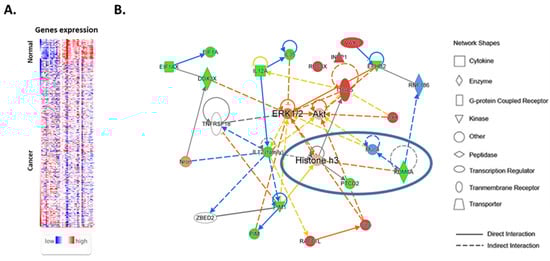 (A) Expressions of sex-biased genes in normal thyroid tissue and thyroid cancer. Expression levels of 37/72 (51%) of the sex-biased genes were altered in thyroid cancer tissue compared with paired normal tissue. (B) IPA indicated a regulatory node converging on ERK1/2, AKT, as well as on histone H3. Red and green colors indicate genes that were up-regulated in male and female thyroid tissues, respectively. Blue color indicates a predictive inhibitory effects.