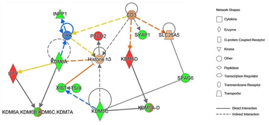IPA also identified five significant networks associated with the differentially expressed genes in the female and male normal thyroid. These networks were scored based on the number of genes participating in any particular network. The most significant network included 22 sex-biased genes (Figure 1B). The IPA suggested the role of sex-biased genes in histone modification. Specifically, a node converging on histone-3 methylation included a set of demethylases (KDM5C, KDM5D, and KDM6A) that contribute to the formation of histone-modifying complexes and catalyze the demethylation of tri/di-methylated histone H3.