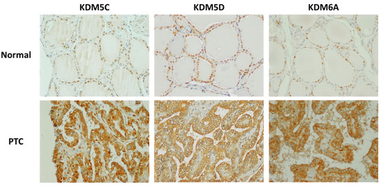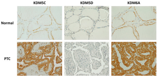 Immunohistochemical staining of KDM5C, KDM5D, and KDM6A in normal thyroid tissues and thyroid cancers from male patients: KDM5C, KDM5D, and KDM6A were all detected inside the nuclei of normal thyroid tissues, whereas in thyroid cancers, all three were primarily detected inside the cytoplasm. Magnification: ×400.