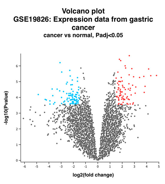 The GEO2R tool, available within the GEO series (https://www.ncbi.nlm.nih.gov/geo/geo2r/, accessed on 1 December 2023) [16], was employed to discern DEGs between non-cancerous tissue and GC tissue samples. Genes lacking corresponding gene symbols and those represented by multiple probes were excluded independently. A threshold of |Log2FC| > 1.5 and an adjusted p < 0.05 were applied as criteria for statistical significance.