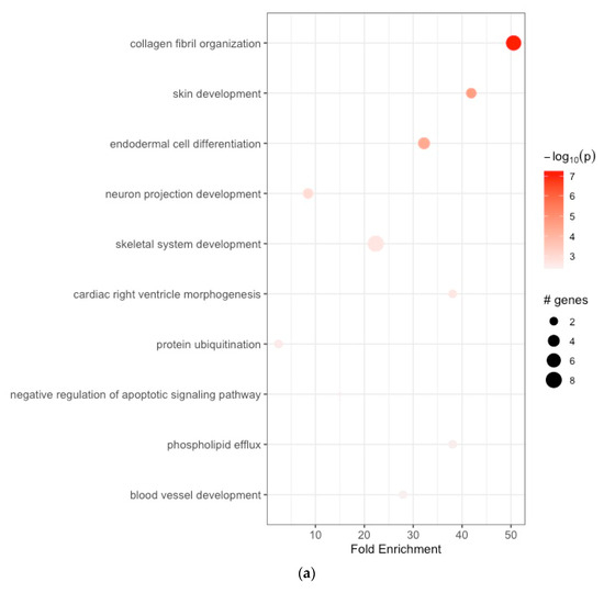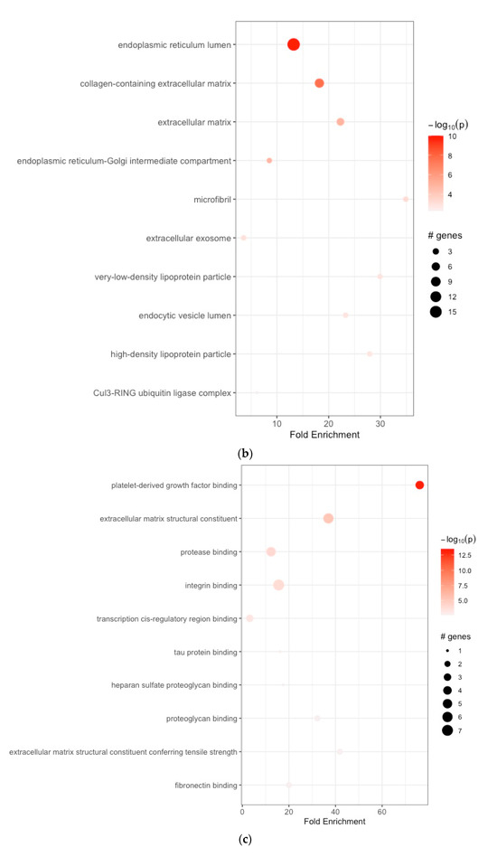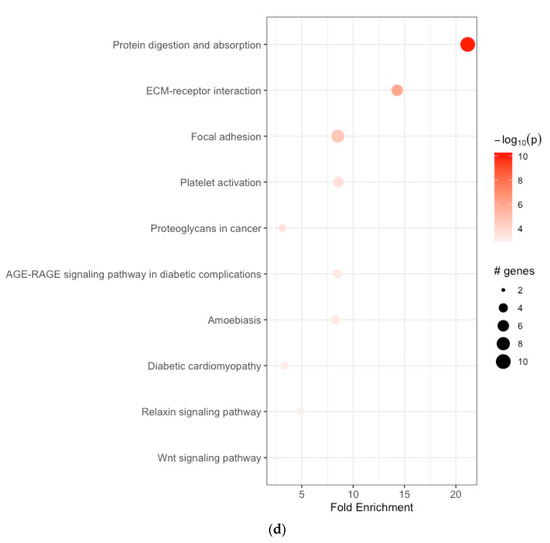 The enriched BPs included collagen fibril organization, skin development, endodermal cell differentiation, neuron projection development, skeletal system development, cardiac right ventricle morphogenesis, protein ubiquitination, negative regulation of the apoptotic signaling pathway, phospholipid efflux, and blood vessel development (Figure 2a, Table 1a). The CCs were endoplasmic reticulum lumen, collagen-containing extracellular matrix, extracellular matrix, endoplasmic reticulum–Golgi intermediate compartment, microfibril, extracellular exosome, very-low-density lipoprotein particle, endocytic vesicle lumen, high-density lipoprotein particle, and Cul3-RING ubiquitin ligase complex (Figure 2b, Table 1b). The enriched MFs included platelet-derived growth factor binding, extracellular matrix structural constituent, protease binding, integrin binding, transcription cis-regulatory region binding, tau protein binding, heparan sulfate proteoglycan binding, proteoglycan binding, extracellular matrix structural constituent conferring tensile strength, and fibronectin binding (Figure 2c, Table 1c). The KEGG pathway analysis revealed enrichment in protein digestion and absorption, ECM–receptor interaction, focal adhesion, platelet activation, proteoglycans in cancer, the AGE-RAGE signaling pathway in diabetic complications, amoebiasis, diabetic cardiomyopathy, the relaxin signaling pathway, and the Wnt signaling pathway (Figure 2d, Table 1d).