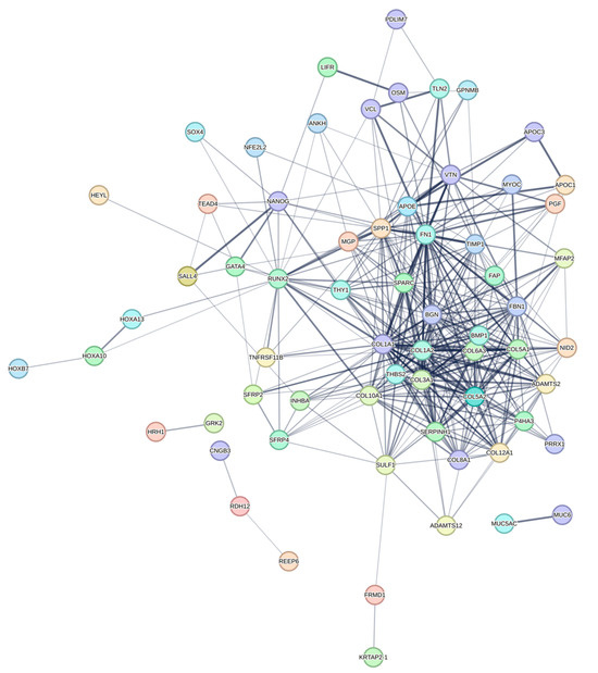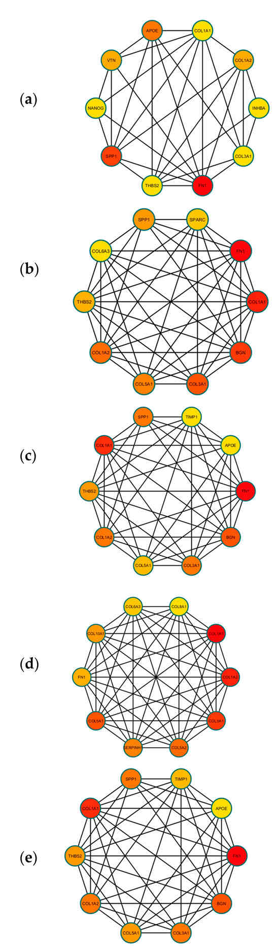 Our results indicate that patients with an elevated expression of six hub DEGs, screened out by the five methods mentioned above, were associated with a poor survival rate. The corresponding Kaplan–Meier curves can be seen in Figure 7a–i. Patients with an increased expression of FN1, COL1A2, THBS2, COL3A1, COL5A1, and BGN showed a poorer prognosis.