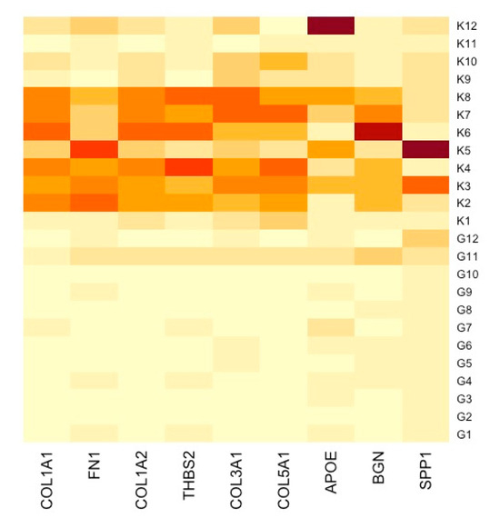 COL1A2 is responsible for encoding a chain integral to type I collagen, the predominant fibrillar collagen present in the majority of connective tissues [67]. COL3A1 and COL5A1 encode the alpha-1 chains for type III and V collagen, respectively [67]. COL1A2, COL3A1, and COL5A1 are highly prevalent structural proteins within the ECM. An earlier bioinformatic analysis has also revealed the correlation between COL1A2, COL3A1, COL5A1, FN1, and CAF infiltration in GC [66]. Furthermore, our study demonstrates that the expression of COL1A2, COL3A1, and COL5A1 was positively correlated with M2 macrophages and negatively correlated with activated dendritic cells and CD8+ T-cell infiltration. Hence, we suggest that these genes may play an important role in maintaining and creating an immunosuppressive TME and subsequently promoting tumor progression.