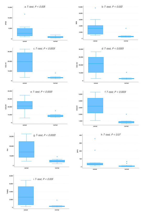 (a) The expression pattern of APOE in normal and GC tissue. (b) The expression pattern of BGN in normal and GC tissue. (c) The expression pattern of COL1A1 in normal and GC tissue. (d) The expression pattern of COL1A2 in normal and GC tissue. (e) The expression pattern of COL3A1 in normal and GC tissue. (f) The expression pattern of COL5A1 in normal and GC tissue. (g) The expression pattern of FN1 in normal and GC tissue. (h) The expression pattern of SPP1 in normal and GC tissue. (i) The expression pattern of THBS2 in normal and GC tissue.