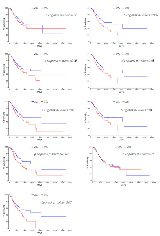 - Anaya, J. OncoLnc: Linking TCGA survival data to mRNAs, miRNAs, and lncRNAs. PeerJ Comput. Sci. 2016, 2, e67. [Google Scholar] [CrossRef]