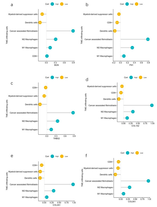 We investigated the correlation between the expression of the aforementioned selected genes, which were associated with survival, and the infiltration of cancer-associated fibroblasts, CD8+ activated dendritic cells, macrophages, and myeloid-derived suppressor cells (MDSCs). BGN demonstrated a direct correlation with cancer-associated fibroblasts, as well as M1 and M2 macrophages. Conversely, it exhibited an inverse relationship with MDSCs and activated dendritic cells (Figure 8a). FN1 exhibited a positive connection with cancer-associated fibroblasts and M2 macrophages while demonstrating a negative correlation with activated dendritic cells (Figure 8b). THBS2 showcased a positive correlation with M1 and M2 macrophages and cancer-associated fibroblasts. In contrast, it showcased a negative correlation with activated dendritic cells (Figure 8c). COL1A2 displayed a positive association with M1 and M2 macrophages and cancer-associated fibroblasts. Conversely, it exhibited a negative association with activated dendritic cells (Figure 8d). COL3A1 demonstrated a positive correlation with M2 macrophages and cancer-associated fibroblasts. It also showcased a negative correlation with activated dendritic cells and MDSCs (Figure 8e). COL5A1 depicted a positive association with M2 macrophages and cancer-associated fibroblasts. Simultaneously, it portrayed a negative association with activated dendritic cells (Figure 8f). The Pearson correlation curves can be seen in the Supplementary Figures.